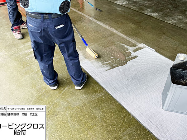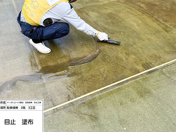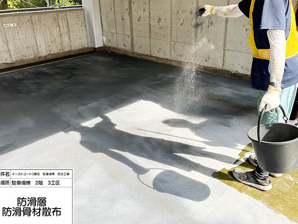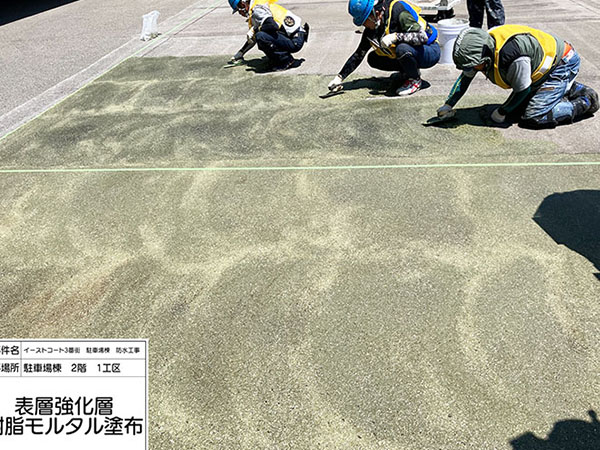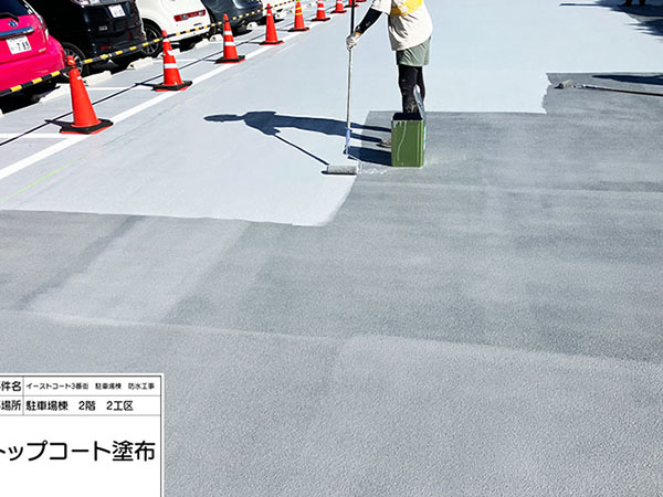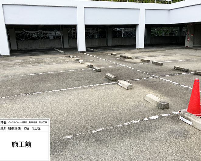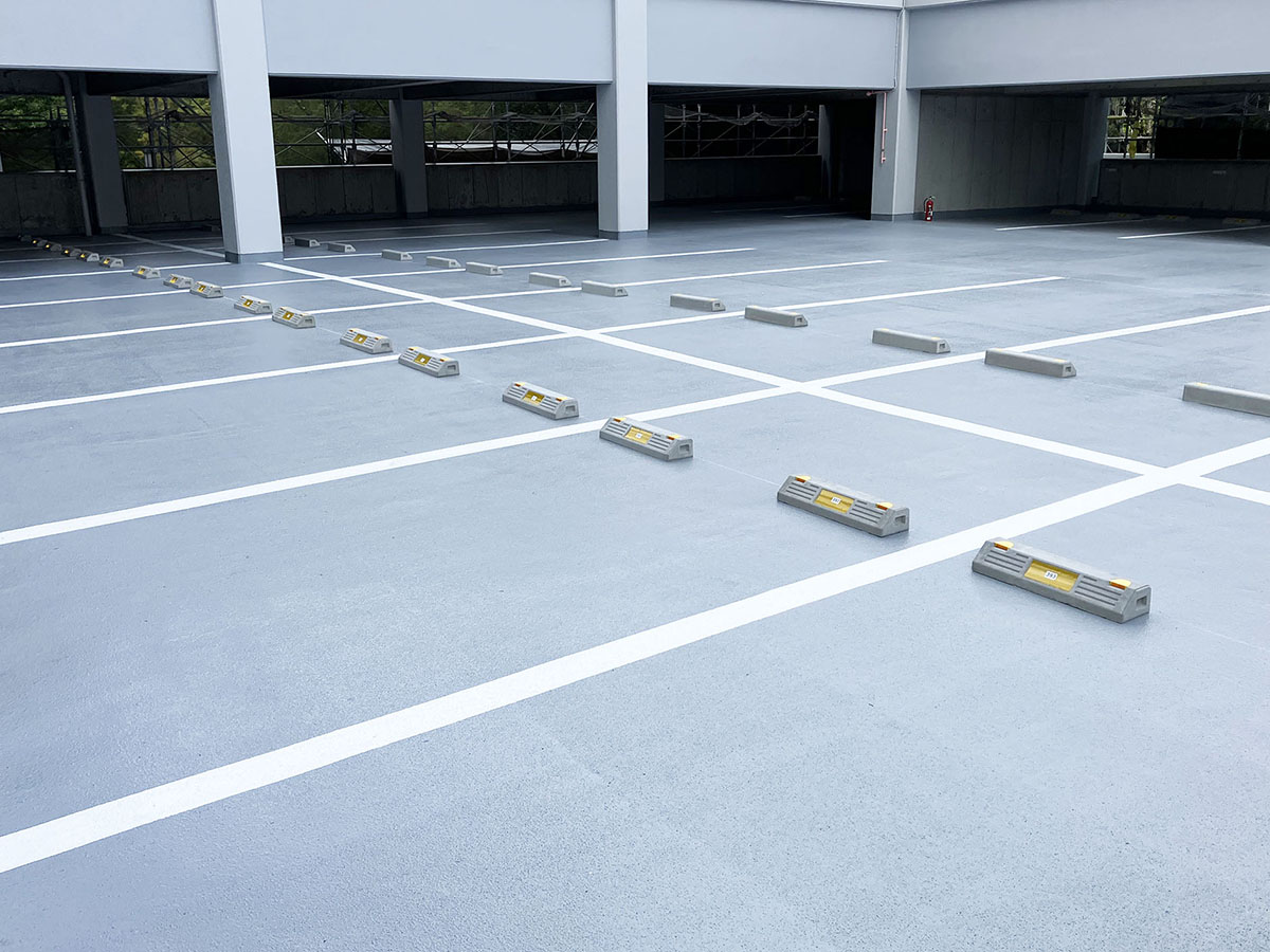 場所:兵庫県神戸市 用途:屋上駐車場 竣工:2023 年11 月 工期:4ヶ月 面積:2,985 ㎡ 工法:速硬化MMA樹脂FRP複合防水工法