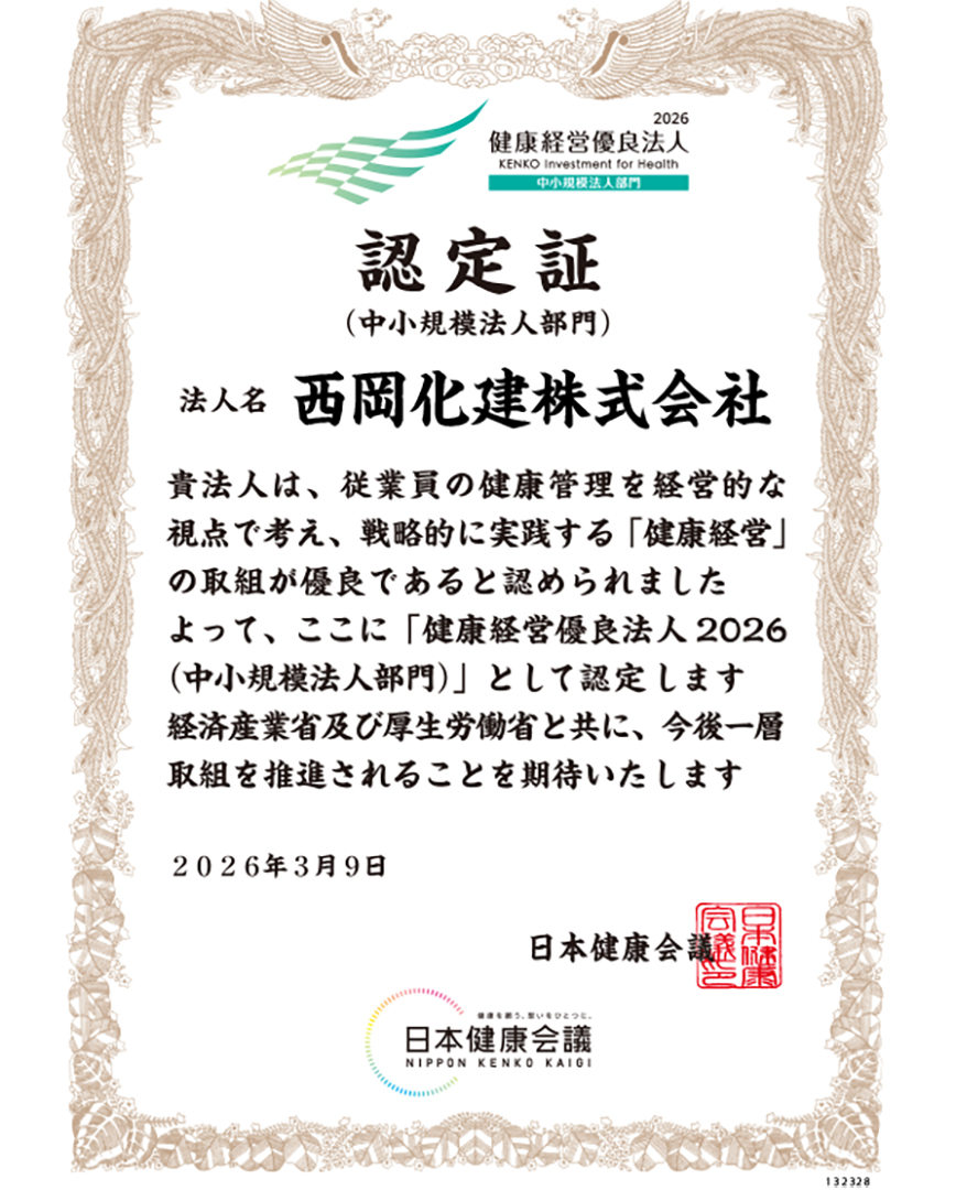 西岡化建株式会社は、経済産業省と日本健康会議が進める健康経営優良法人認定制度において「健康経営優良法人2026(中小規模法人部門)」に認定されました。